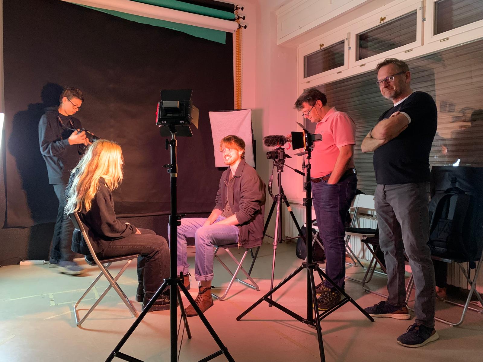 Při své práci spolupracujeme s herci a filmaři z filmové školy Aeroškola Praha, kde se učíme vyprávět příběhy. Pod vedením filmové režisérky Viktorie Rampal Dzurenko a kameramana Radjana Rampala (Viktori&Rampals) vznikají naše krátké filmy, ale tvoříme i mimo školní rámec – zkoušíme nové formáty, dokumentujeme semináře, natáčíme reels. Fotky z natáčení ukazují, jak nás to baví.